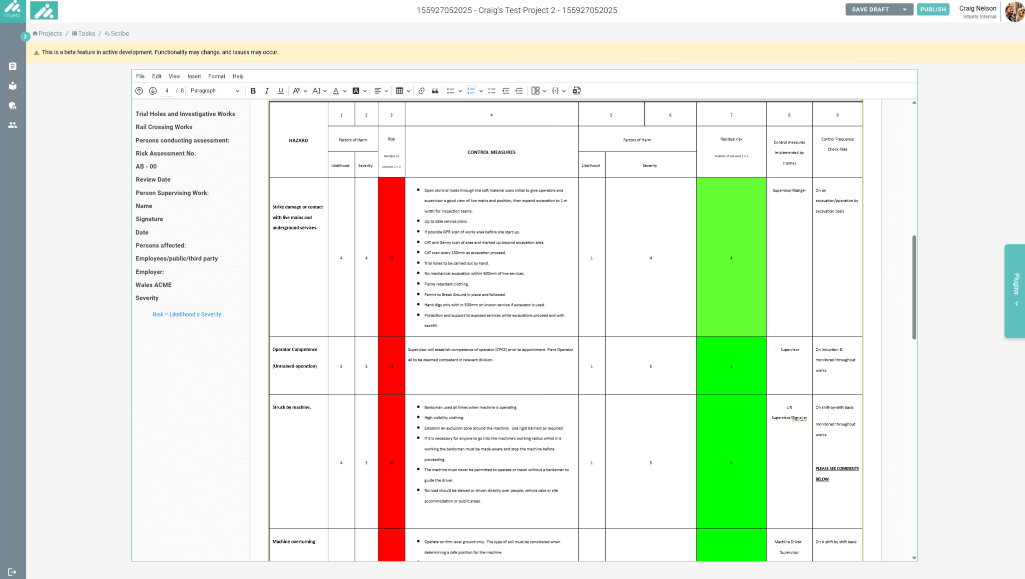 Intuety’s Document Creator is a feature-rich module designed to assist teams in developing, managing, and submitting structured RAMS within the platform. It allows users to build RAMS directly within Intuety, complete with live, data-driven insights. Whether you’re starting from scratch or working with an existing document, we make the process effortless: